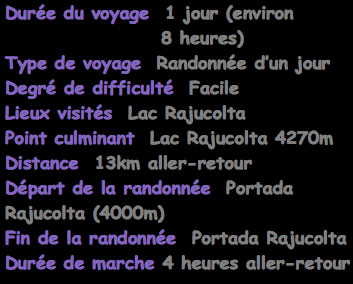Nous quittons Huaraz à 8 heures du matin et voyageons vers le sud le long de la route principale jusqu’au village de Macashca. De là, nous suivons une piste en mauvais état qui traverse la vallée de Pariac jusqu'à l'entrée de la vallée de Rajucolta. À peine une heure et demie de route après, nous débutons une randonnée facile, suivant une ancienne route de terre abandonnée, à travers la vallée. Ici, après environ deux heures de marche jusqu'au lac, s’offre tout au long du sentier une vue imprenable sur l'impressionnant Mont Huantsan. Au bord du lac, au coeur de vues exceptionnelles, nous profitons d'un pique-nique avant de reprendre le chemin du retour vers la portada, où notre véhicule nous attend pour nous ramener à Huaraz. Nous sommes de retour en ville vers 16 heures. |