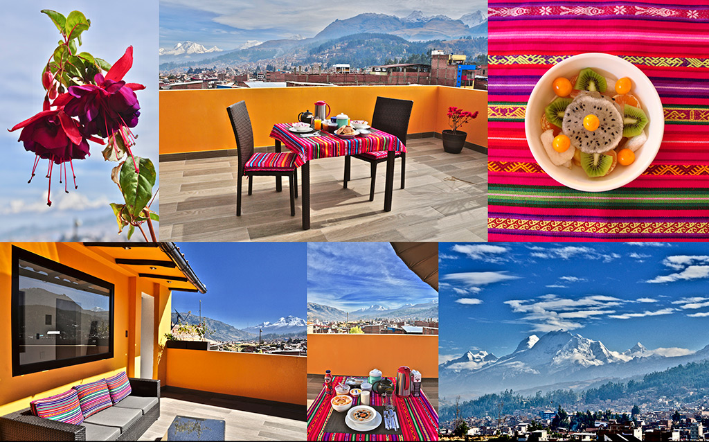 ![]() On the ground floor there is a pleasant patio, which is the perfect area to chill with a beautiful garden, comfortable sofas, chairs and coffee tables, as well as a fully equipped kitchen and a bouldering wall available for guests to use as they please. ![]() Our second floor terrace offers magnificent vistas of the Cordillera Blanca mountain range. Breakfast is served here. There are comfortable tables, chairs, a sofa and parasols making it the perfect place to rest while enjoying stunning views. ![]() We also have our travel agency onsite. ![]() |