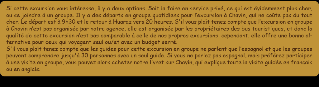 Nous quittons Huaraz aux environs de 8 heures du matin, en véhicule privé, en direction du village de Chavin, située à 109 km dans la province de Huari. Nous traversons la partie sud de la Vallée de Huaylas et passons par Recuay, un des rares villages de la région à avoir conservé son architecture traditionnelle après le tremblement de terre de 1970. En route, nous nous arrêtons pour 20 minutes environ au bord du magnifique lac de Querococha (3980m), situé au pied des monts Yanamarey (5237m) et Pucaraju (5322m). Il n’est pas rare d’apercevoir des lamas et des alpagas broutant près du lac. De là, la route grimpe fortement vers le tunnel de Kawish (4516m), creusé à travers la montagne pour déboucher dans la vallée de Conchucos, où niche le remarquable site archéologique de Chavin de Huantar. Nous marquons 10 minutes d’arrêt pour admirer la vallée, avant de descendre vers le village de Chavin où nous arrivons avant midi. Nous explorons les ruines, la visite guidée dure environ 2 heures. Après la visite, nous déjeunons dans un restaurant au village. Ensuite, nous visitons le Musée National de Chavin qui abrite de nombreuses "têtes-clous" délicatement gravées, ainsi que la remarquable obélisque de Tello. Vers 16 heures, nous repartons vers Huaraz pour y être de retour aux environs de 19 heures.