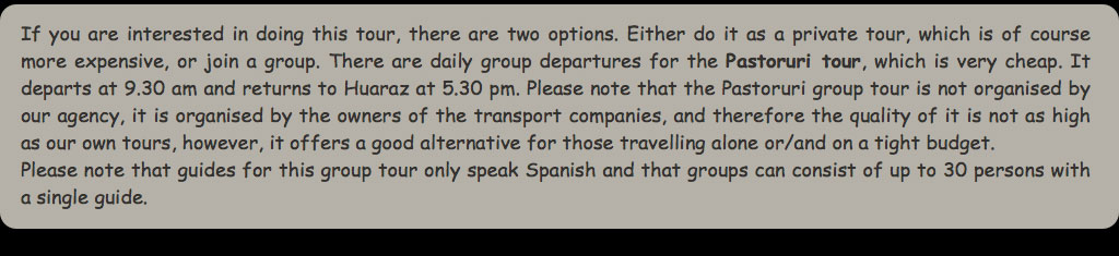 We leave Huaraz at 8 am and travel towards the southern section of the Huascaran National Park. Once we enter the national park we have our first views of some of the Cordillera Blanca’s stunning mountains, looming high above the pristine Raria valley. We stop at Lake Patococha to enjoy the beautiful scenery and observe the Andean ducks that often swim in the lake. Further on we stop again at the unusual Pumapampa spring with natural gas. From here, we can clearly see the imposing snow-capped peak of Mount Mururaju (5688m), which dominates this part of the valley. Later on we stop for one of the highlights of the tour: the rare, gigantic Puya Raimondi plants dotted across the valley. We can also admire the Pumashimi pond with its beautiful waters in seven shades of blue. The road now climbs steeply upwards towards the Pastoruri Glacier. We pass beautiful mountains with cascading glaciers and eventually reach Pastoruri at around 11 am. It takes around 40 minutes on foot along a gently sloping path to reach the ice proper. Those not feeling up to the walk can hire horses. The receding Pastoruri Glacier, despite having lost a huge portion of its ice in recent years, is still the only glacier accessible by road and is, for this reason, totally unique. We spend a few hours at the glacier before driving back to Huaraz. On the way we make a last stop at some ancient cave paintings. We get back to Huaraz at around 6 pm.
