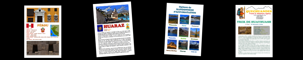 • Pour les réservations par internet, une série de documents PDF envoyés par email, comprenant l'itinéraire détaillé du trek, des informations sur Huaraz avec des recommandations d'hôtels, restaurants, etc., des informations sur le Pérou, les options pour les randonnées d'acclimatation
