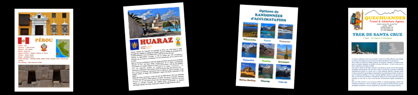 • Pour les réservations par internet, une série de documents PDF envoyés par email, comprenant l'itinéraire détaillé du trek, des informations sur Huaraz avec des recommandations d'hôtels, restaurants, etc., des informations sur le Pérou, les options pour les randonnées d'acclimatation