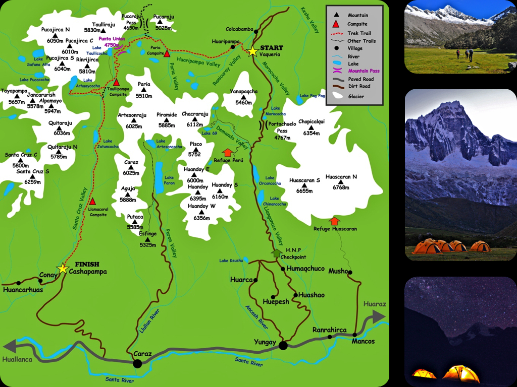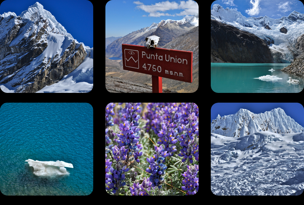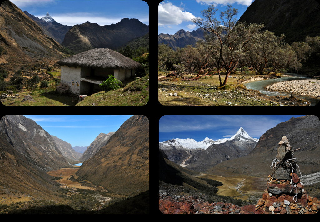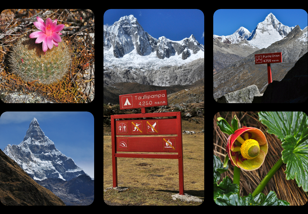 Ce trek vous permet de jouir d’une variété de paysages montagneux spectaculaires, avec des vues à couper le souffle sur la blancheur immaculée d’imposants pics glacés. Il y a parmi ceux-ci le célèbre mont Alpamayo (5947m); le mont Artesonraju (6025m), qui figure sur le logo de Paramount Pictures; et le mont Taulliraju (5830m). Ajoutez à cela des lacs d’un bleu pur ainsi que de profondes et verdoyantes vallées où l’on trouve quantité de plantes exotiques, et vous voici au coeur d’une des plus extraordinaires régions d’Amérique du Sud.