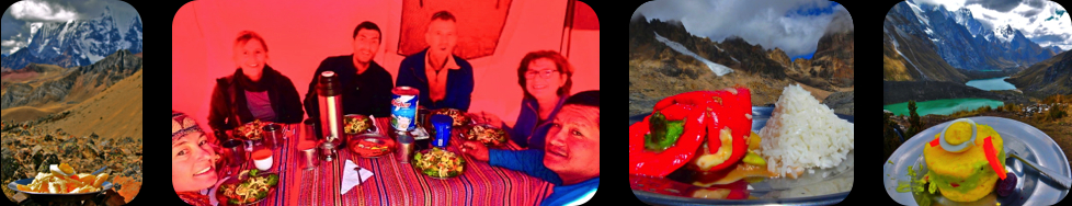All food during the trek is provided. We offer a combination of Peruvian and Western dishes. The varied, good-quality, high-energy food prepared by our professional cook is specifically suited to rigorous activity.