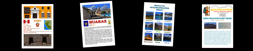 • For advanced bookings a series of PDF’s that we send to you by email, including the trek’s detailed itinerary, information about Huaraz with recommendations of hotels, restaurants, etc., information about Peru, options for acclimatisation hikes