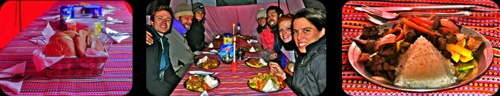 For dinner, you will be served a soup (mixed vegetable soup with quinoa, pasta or semolina) + main course (lomo saltado, spaghetti bolognese, trout with mashed potato and boiled vegetables) + dessert (chocolate pudding, rice pudding, caramel flan) + hot drinks in the dining tent.